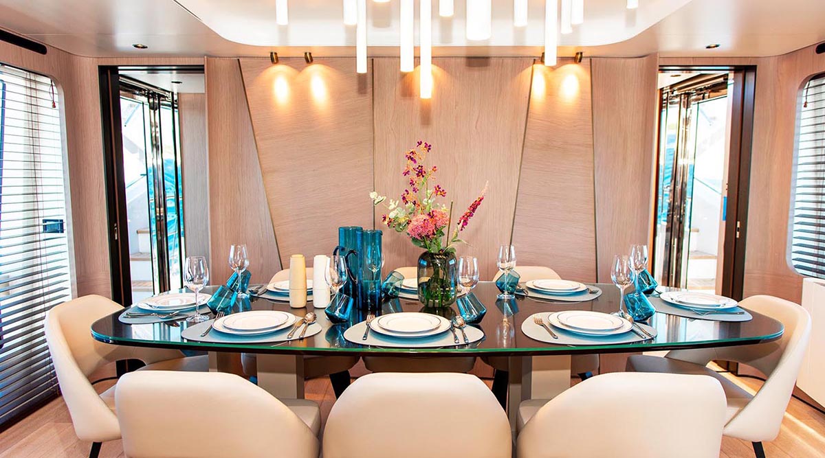 Dawo was built in 2020 and offers guest accommodation for 10 people in five suites. There is a master suite on the main deck, 2 VIP cabins, and 2 twin cabins. The master suite, which is full beam and has a large dressing area, offers ample storage space. There are 7 beds total, including 1 queen, 2 queens, and 4 singles. To ensure relaxed luxury yacht charters, she can carry up to four crew members.